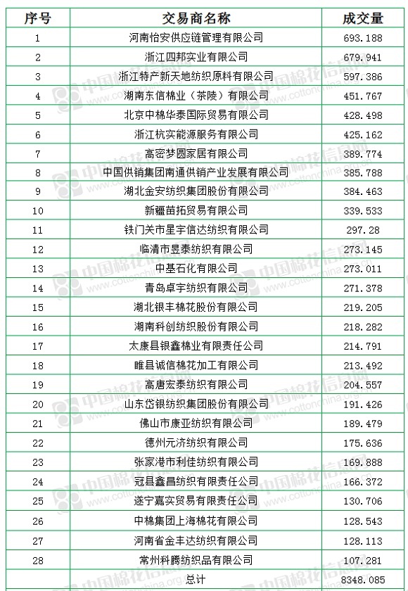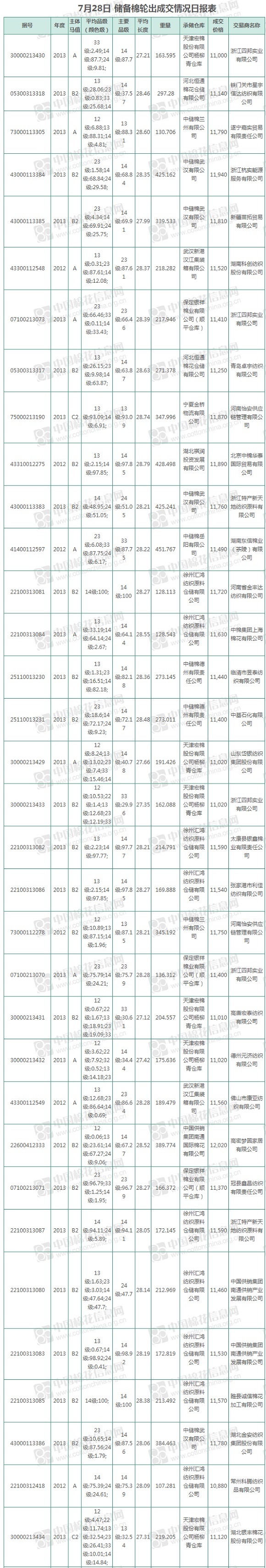 中國(guó)儲(chǔ)備棉管理有限公司定于7月28日上市銷售儲(chǔ)備棉重量8348.085噸,實(shí)際成交8348.085噸,成交率100%,成交均價(jià)11546元/噸,較27日下跌66元/噸,折3128價(jià)格12892元/噸,較27日下跌25元/噸。