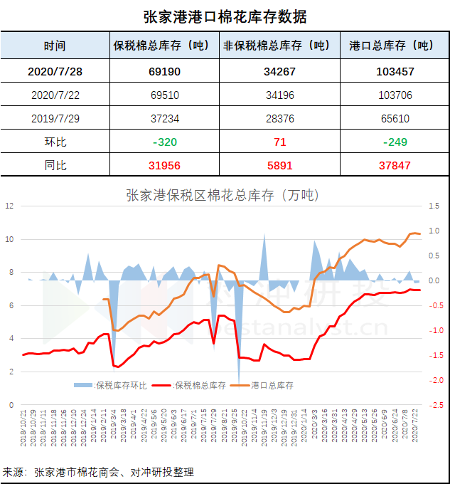 據(jù)張家港市棉花商會(huì),截止2020年7月28日,張家港非保稅棉34267噸,保稅棉69190噸,共103457噸。進(jìn)區(qū)1526噸,出區(qū)1880噸。