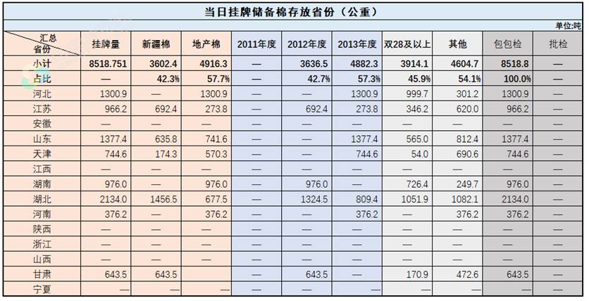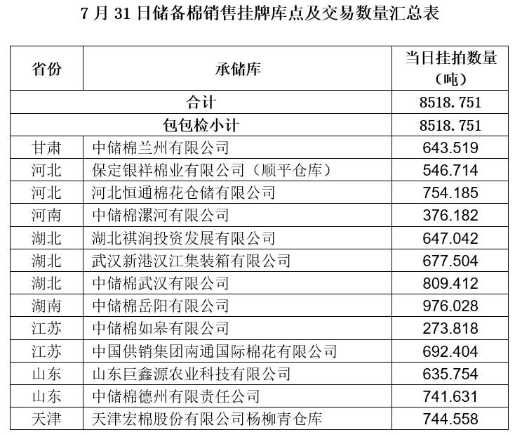 中國儲備棉管理有限公司定于7月31日上市銷售儲備棉重量8518.751噸,共31捆。具體庫點及數量見下表。