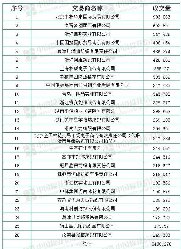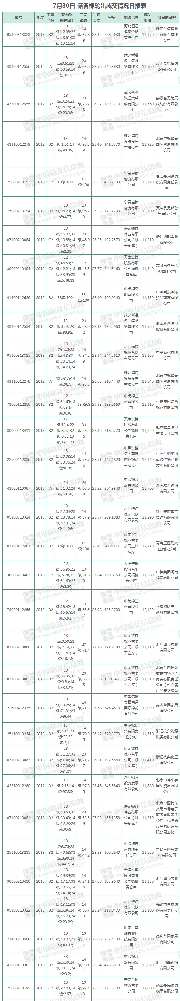中國(guó)儲(chǔ)備棉管理有限公司定于7月30日上市銷售儲(chǔ)備棉重量8458.278噸,實(shí)際成交8458.278噸,成交率100%,成交均價(jià)11680元/噸,較29日上漲21元/噸,折3128價(jià)格12836元/噸,較29日上漲26元/噸。