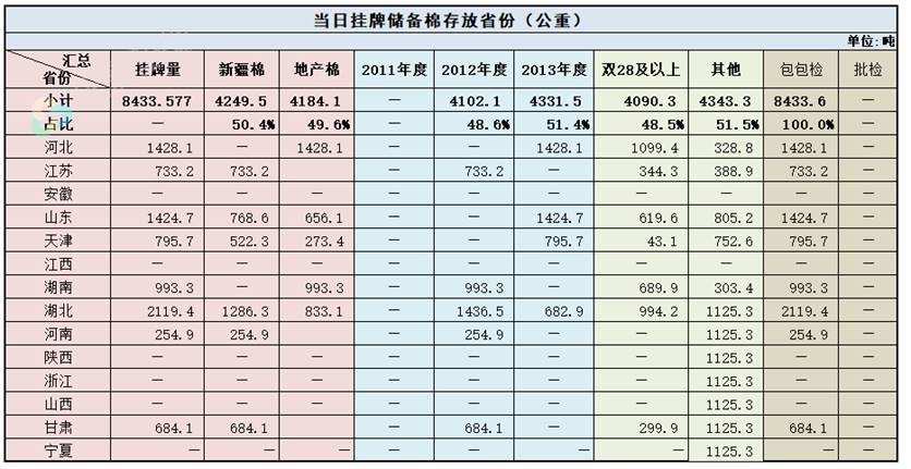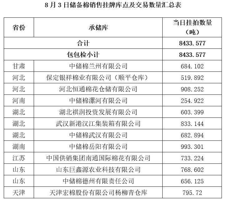 中國儲備棉管理有限公司定于8月3日上市銷售儲備棉重量8433.577噸,共33捆。具體庫點及數(shù)量見下表。