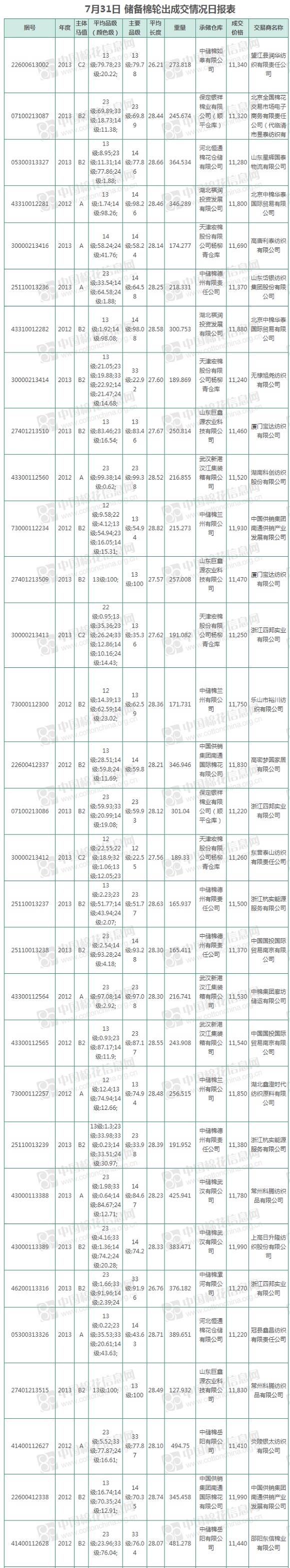 中國儲備棉管理有限公司定于7月31日上市銷售儲備棉重量8518.751噸,實際成交8518.751噸,成交率100%,成交均價11544元/噸,較30日下跌136元/噸,折3128價格12882元/噸,較30日上漲46元/噸。