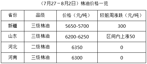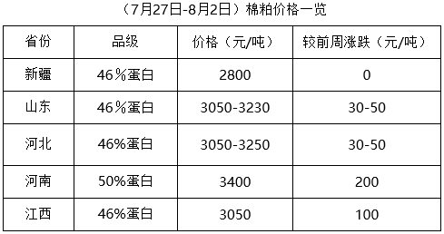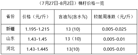 上周(7月27日-8月2日),期貨豆油、豆粕走勢(shì)略有不同,豆油先行回落后持續(xù)大漲,豆粕上周一沖高后大幅回落,但現(xiàn)貨豆油、豆粕外圍利多因素較多,支撐棉油、棉粕價(jià)格持續(xù)上漲,油棉廠整體加工量略有增加。但因新疆棉籽出疆困難,棉籽貨少價(jià)漲,部分地區(qū)價(jià)格雖有波動(dòng),但整體仍處漲勢(shì),市場(chǎng)成交少量。