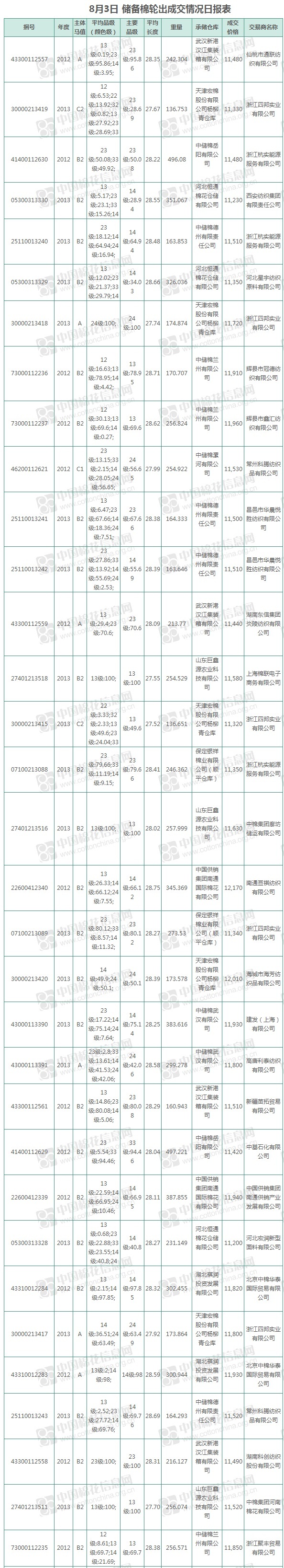 中國儲備棉管理有限公司定于8月3日上市銷售儲備棉重量8433.577噸,實(shí)際成交8433.577噸,成交率100%,成交均價(jià)11619元/噸,較31日上漲75元/噸,折3128價(jià)格12933元/噸,較31日上漲51元/噸。