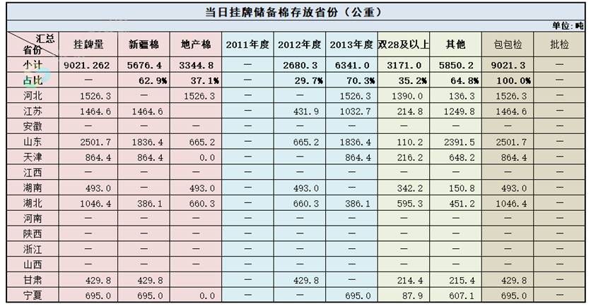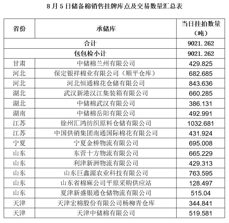 中國(guó)儲(chǔ)備棉管理有限公司定于8月5日上市銷售儲(chǔ)備棉重量9021.262噸,共43捆。具體庫(kù)點(diǎn)及數(shù)量見下表。