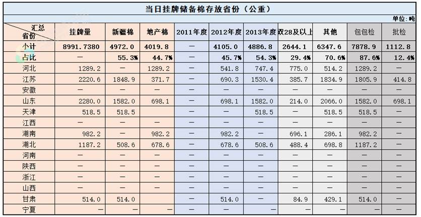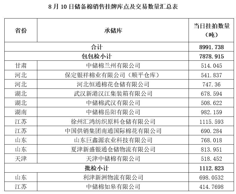 中國(guó)儲(chǔ)備棉管理有限公司定于8月10日上市銷售儲(chǔ)備棉重量8991.738噸,共42捆。具體庫點(diǎn)及數(shù)量見下表。