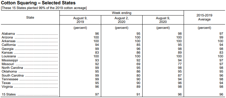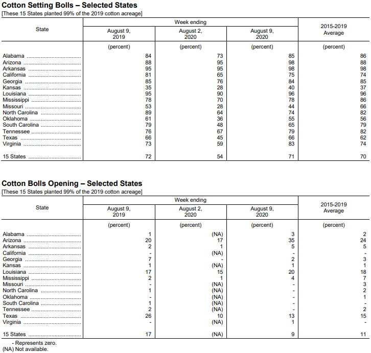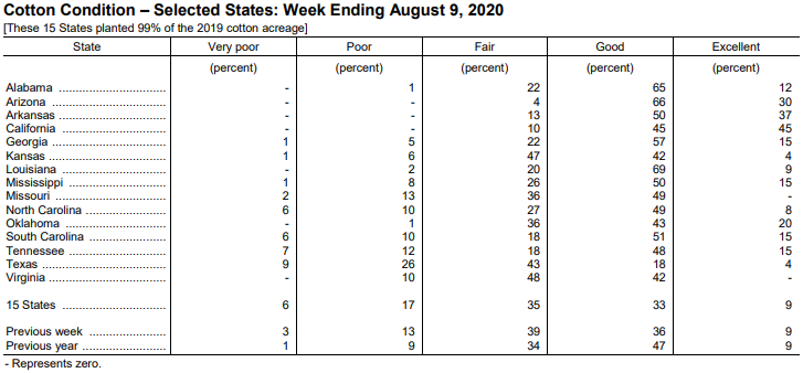 美國農(nóng)業(yè)部8月10日發(fā)布的美國棉花生產(chǎn)報告顯示,截至8月9日,美棉蕾鈴率為96%,前周為91%,去年同期為97%,5年均值為96%。美棉結(jié)鈴進度為71%,前周為54%,去年同期為72%,5年均值為70%。美棉吐絮進度為9%,去年同期為17%,5年均值為11%。美棉優(yōu)良率為42%,前周為45%,去年同期為56%;其中得州優(yōu)良率為22%,較前周減少3個百分點,差苗率為35%,較前周增加11個百分點。
