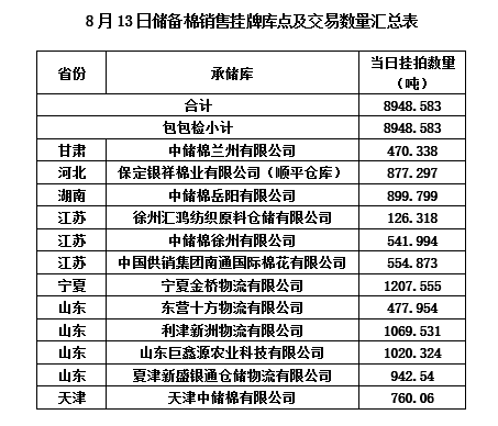 中國儲備棉管理有限公司定于8月13日上市銷售儲備棉重量8948.583噸,共38捆,其中新疆棉4321.948噸。