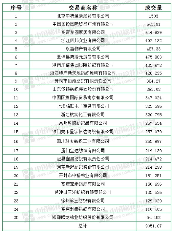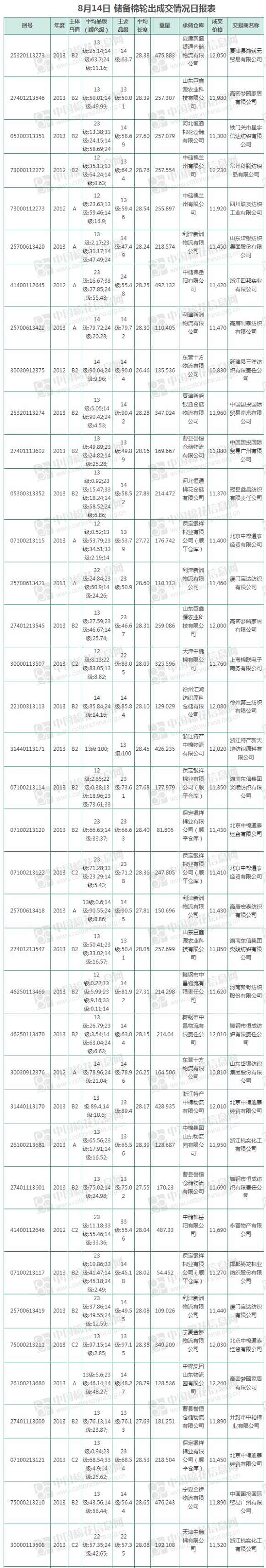 中國儲備棉管理有限公司定于8月14日上市銷售儲備棉重量9051.67噸,實際成交9051.67噸,成交率100%,成交均價11735元/噸,較13日上漲50元/噸,折3128價格12970元/噸,較13日上漲71元/噸。