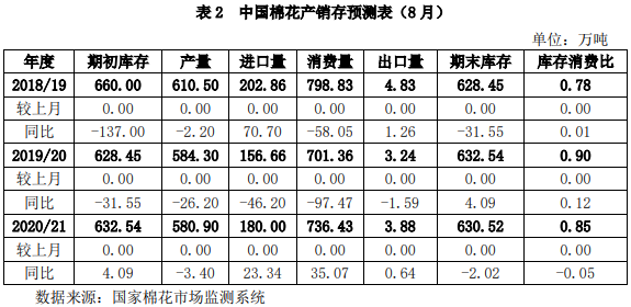 從近期的情況看,新疆每日新增病例逐步減少,疫情在可控范圍之內(nèi),影響新棉采收上市的可能性不大。2019/20棉花年度接近尾聲,新棉長勢基本正常,新年度棉花供應(yīng)預(yù)期保持穩(wěn)定,國家棉花市場監(jiān)測系統(tǒng)8月國內(nèi)棉花產(chǎn)需預(yù)測維持不變(表2),新舊年度棉價有望平穩(wěn)接軌。在新棉規(guī)模上市前,來自國際市場的不穩(wěn)定性和不確定性將在一定程度抑制國內(nèi)棉價上漲,但從中長期看,在消費(fèi)持續(xù)恢復(fù)的大趨勢下,棉花收購價格將會隨著新棉資源的逐步減少而出現(xiàn)一個穩(wěn)步上漲的過程,總體上呈現(xiàn)低開高走態(tài)勢。