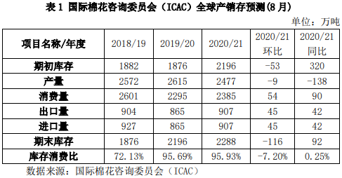 據(jù)國際棉花咨詢委員會(ICAC)最新發(fā)布的全球棉花產(chǎn)需預(yù)測(表1),2020/21年度全球棉花產(chǎn)量2477萬噸,較上月下調(diào)9萬噸,同比下降138萬噸,降幅5.3%,消費(fèi)量2385萬噸,較上月調(diào)增54萬噸,同比增加90萬噸,增幅3.9%。產(chǎn)大于需狀況由2019/20年度的320萬噸縮至2020/21年度的92萬噸。全球期末庫存維持在2288萬噸高位。