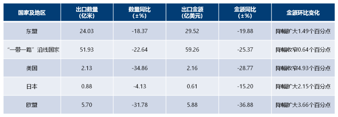 印染八大類(lèi)出口數(shù)量96.95億米,同比減少25.45%;出口金額94.93億美元,同比減少28.91%;出口平均單價(jià)0.98美元/米,同比減少4.64%。