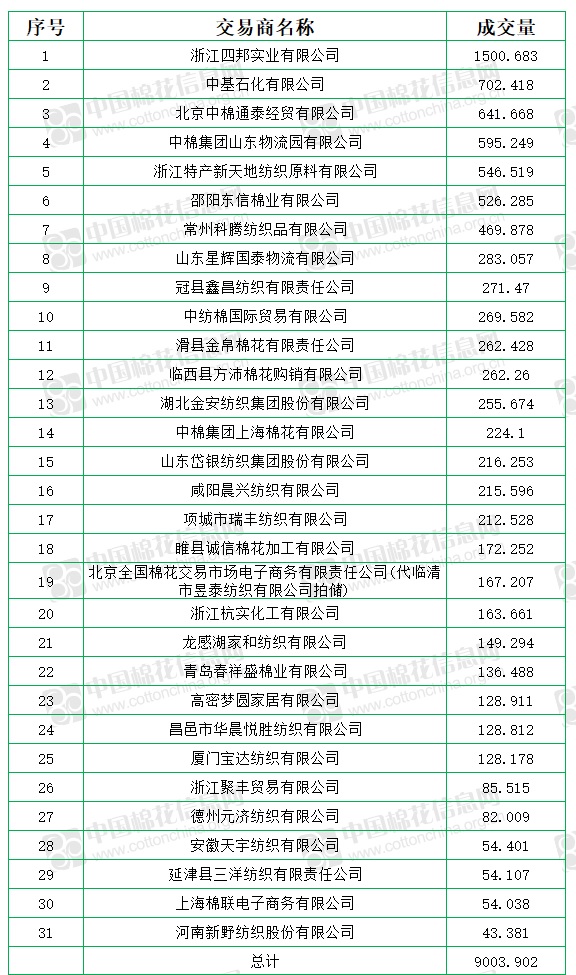 中國儲備棉管理有限公司定于8月20日上市銷售儲備棉重量9003.902噸,實際成交9003.902噸,成交率100%,成交均價11661元/噸,較19日下跌85元/噸,折3128價格12956元/噸,較19日上漲21元/噸。