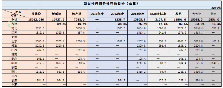 1.當(dāng)日輪出上市儲(chǔ)備棉中有部分為分批抽樣公檢。抽樣比率及抽樣方法按照棉花國家標(biāo)準(zhǔn)規(guī)定,品質(zhì)指標(biāo)包括顏色級(jí)、軋工質(zhì)量、長(zhǎng)度、馬克隆值、斷裂比強(qiáng)度、長(zhǎng)度整齊度指標(biāo);重量采用原入庫公檢結(jié)果,不再重新檢驗(yàn)。