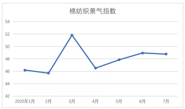 說明:中國棉紡織行業(yè)景氣指數(shù)采集自全國近500家次棉紡織企業(yè),參考國家制造業(yè)PMI等指數(shù)制定方式,通過對多個主要指標(biāo)加權(quán)計(jì)算得出,當(dāng)指數(shù)高于50,表示棉紡織行業(yè)本月景氣程度好于上月,低于50則表示本月景氣程度不及上月。