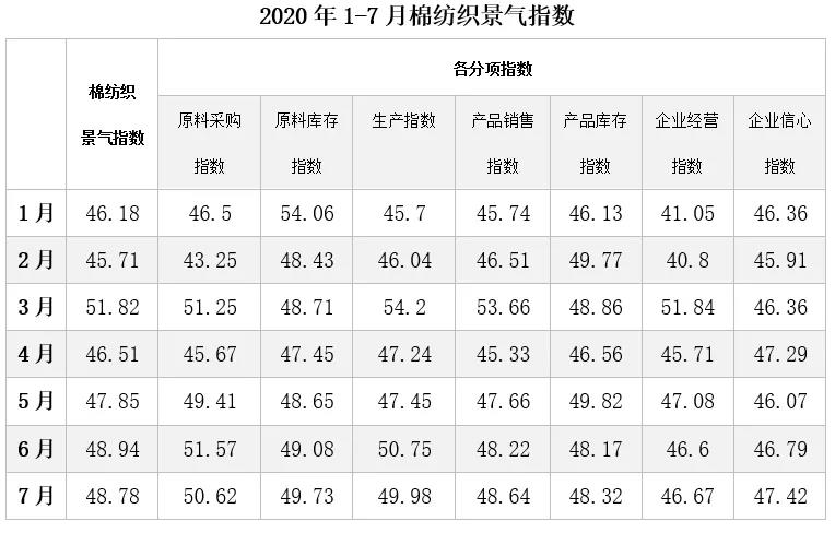 國內(nèi)方面,7月中國制造業(yè)采購經(jīng)理指數(shù)(PMI)為51.5%,延續(xù)上月向好走勢,說明我國經(jīng)濟(jì)繼續(xù)保持回升狀態(tài)。從分類指數(shù)看,生產(chǎn)指數(shù)為54.0%,其中紡織服裝服飾制造自疫情以來首次升至臨界點(diǎn)以上,說明紡服生產(chǎn)已基本步入正軌。從需求端看,新訂單指數(shù)為51.7%,表明我國經(jīng)濟(jì)環(huán)境整體回暖,但紡服新訂單指數(shù)仍在臨界點(diǎn)以下,紡企經(jīng)營壓力不減。生產(chǎn)、訂單方面與中棉行協(xié)調(diào)查問卷結(jié)果一致。