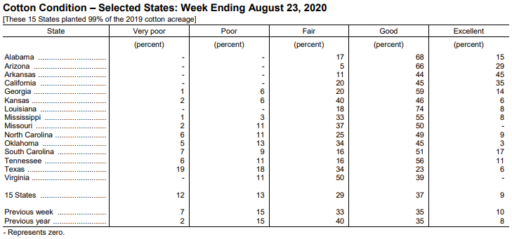 美國(guó)農(nóng)業(yè)部8月24日發(fā)布的美國(guó)棉花生產(chǎn)報(bào)告顯示,截至8月23日,美棉蕾鈴率為88%,前周為80%,去年同期為89%,5年均值為89%。美棉吐絮進(jìn)度為22%,前周為15%,去年同期為27%,5年均值為19%。美棉優(yōu)良率為46%,前周為45%,去年同期為43%;其中得州優(yōu)良率為29%,較前周增加2個(gè)百分點(diǎn),差苗率為37%,較前周增加4個(gè)百分點(diǎn)。