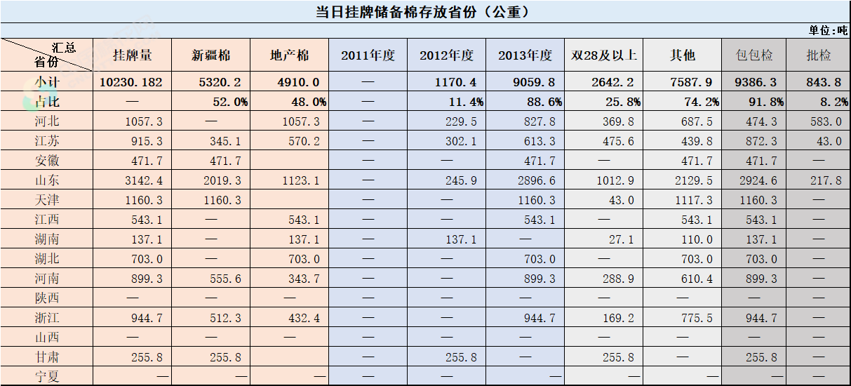 1.當(dāng)日輪出上市儲(chǔ)備棉中有部分為分批抽樣公檢。抽樣比率及抽樣方法按照棉花國家標(biāo)準(zhǔn)規(guī)定,品質(zhì)指標(biāo)包括顏色級(jí)、軋工質(zhì)量、長度、馬克隆值、斷裂比強(qiáng)度、長度整齊度指標(biāo);重量采用原入庫公檢結(jié)果,不再重新檢驗(yàn)。