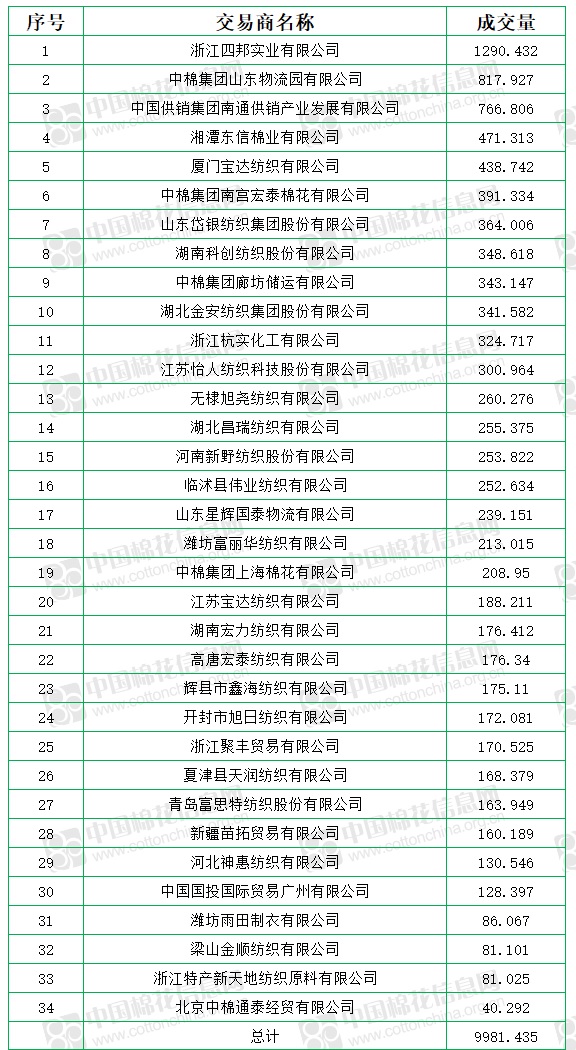 中國(guó)儲(chǔ)備棉管理有限公司定于8月27日上市銷售儲(chǔ)備棉重量9981.435噸,實(shí)際成交9981.435噸,成交率100%,平均加價(jià)11966元/噸,較26日下跌27元/噸,折3128價(jià)格13398元/噸,較26日下跌6元/噸。
