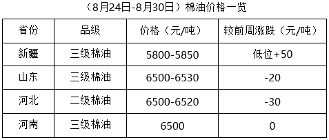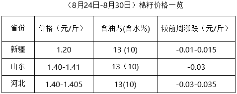 上周(8月24-30日),期貨大豆及豆類產(chǎn)品價格低位反彈,現(xiàn)貨相應(yīng)跟隨,支撐棉油、棉粕行情。但因下游需求不佳,棉油波動調(diào)整,成交少量,棉粕延續(xù)下跌趨勢,油棉廠經(jīng)營盈利困難,棉籽收購謹慎,價格高位續(xù)跌。新年度棉籽即將上市,多數(shù)油棉廠停機,等待新籽上市開工,個別油棉廠堅持收購加工,積極應(yīng)對,市場仍處進一步觀察調(diào)整中。