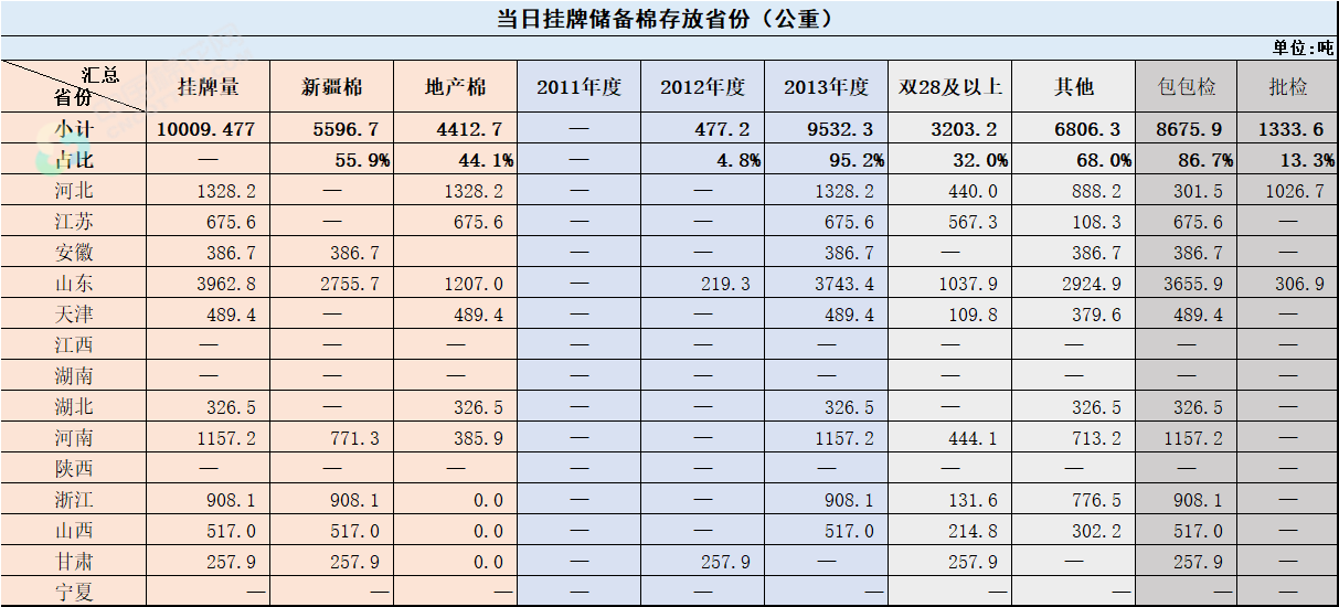 1.當日輪出上市儲備棉中有部分為分批抽樣公檢。抽樣比率及抽樣方法按照棉花國家標準規(guī)定,品質指標包括顏色級、軋工質量、長度、馬克隆值、斷裂比強度、長度整齊度指標;重量采用原入庫公檢結果,不再重新檢驗。