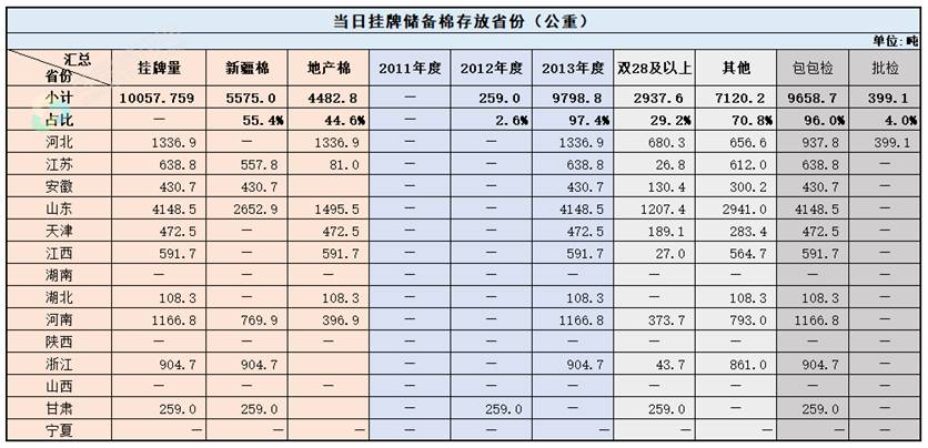 1.當(dāng)日輪出上市儲(chǔ)備棉中有部分為分批抽樣公檢。抽樣比率及抽樣方法按照棉花國(guó)家標(biāo)準(zhǔn)規(guī)定,品質(zhì)指標(biāo)包括顏色級(jí)、軋工質(zhì)量、長(zhǎng)度、馬克隆值、斷裂比強(qiáng)度、長(zhǎng)度整齊度指標(biāo);重量采用原入庫(kù)公檢結(jié)果,不再重新檢驗(yàn)。