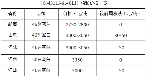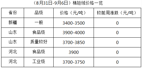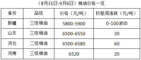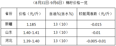 上周(8月31日-9月6日),各地新花陸續(xù)采摘,但采摘量不大,因前期內地雨銹棉較多,質量稍差,除個別軋花廠少量開秤外,多數(shù)地區(qū)軋花廠仍謹慎觀望,暫未行動。棉籽價格持續(xù)下跌,市場資源不足,棉副產品行情震蕩調整,油棉廠少量開工,棉副市場新年度經營全面展開仍需時日。