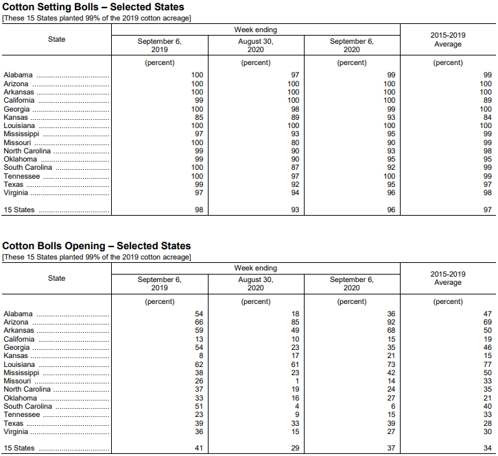 美國農(nóng)業(yè)部9月8日發(fā)布的美國棉花生產(chǎn)報告顯示,截至9月6日,美棉蕾鈴率為96%,前周為93%,去年同期為98%,5年均值為97%。美棉吐絮進(jìn)度為37%,前周為29%,去年同期為41%,5年均值為34%。美棉優(yōu)良率為45%,前周為44%,去年同期為43%。
