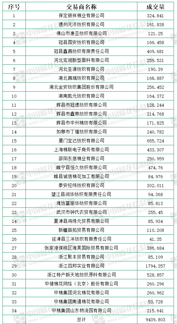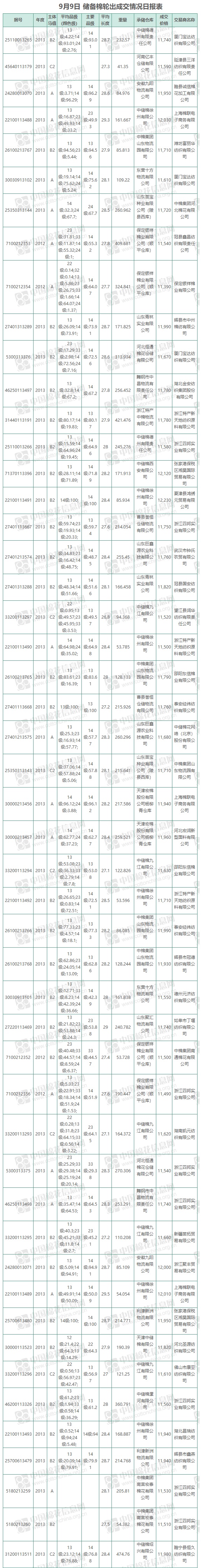 中國(guó)儲(chǔ)備棉管理有限公司定于9月9日上市銷(xiāo)售儲(chǔ)備棉重量10097.115噸,實(shí)際成交9439.803噸,成交率93.49%,成交均價(jià)11744元/噸,較8日下跌341元/噸,折3128價(jià)格13035元/噸,較8日下跌390元/噸。