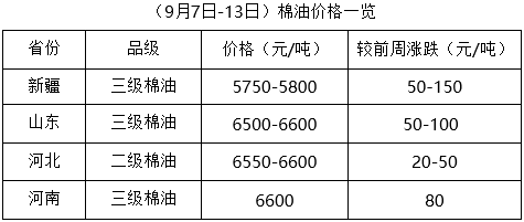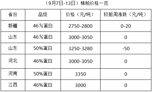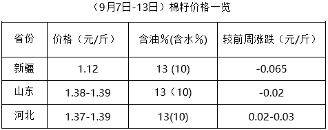 上周(9月7-13日),隨著時(shí)間推移,新花采摘步伐加快,但因軋花廠少有開秤,籽棉上市量不足,新棉籽供應(yīng)較少,油棉廠開工率持續(xù)下降,僅個(gè)別油棉廠維持開工,多數(shù)油棉廠計(jì)劃等待新棉籽大量上市后再行動(dòng),市場(chǎng)采購(gòu)主要以陳棉籽為主,價(jià)格高位續(xù)跌,棉市進(jìn)一步調(diào)整。