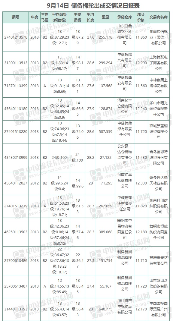 中國儲備棉管理有限公司定于9月14日上市銷售儲備棉重量3027.313噸,實際成交3027.313噸,成交率100%,成交均價11997元/噸,較11日上漲208元/噸,折3128價格13022元/噸,較11日下跌57元/噸。