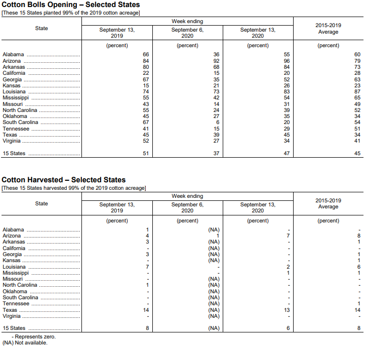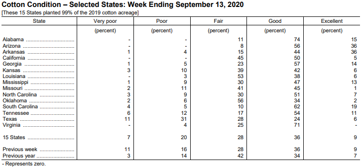 美國農(nóng)業(yè)部9月14日發(fā)布的美國棉花生產(chǎn)報告顯示,截至9月13日當(dāng)周,美棉吐絮進度為47%,前周為37%,去年同期為51%,5年均值為45%。美棉收獲進度為6%,去年同期為8%,5年均值為8%。美棉優(yōu)良率為45%,前周為45%,去年同期為41%。