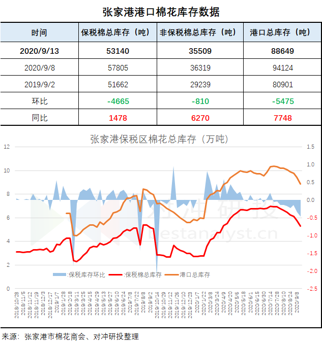 據(jù)張家港市棉花商會(huì),截止2020年9月13日,張家港非保稅棉35509噸,保稅棉53140噸,共88649噸。進(jìn)區(qū)350噸,出區(qū)5813噸。