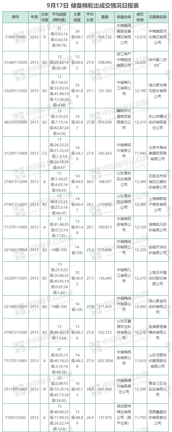 中國儲備棉管理有限公司定于9月17日上市銷售儲備棉重量2964.3154噸,實際成交2964.3154噸,成交率100%,成交均價12131元/噸,較16日上漲60元/噸,折3128價格13586元/噸,較16日下跌280元/噸。
