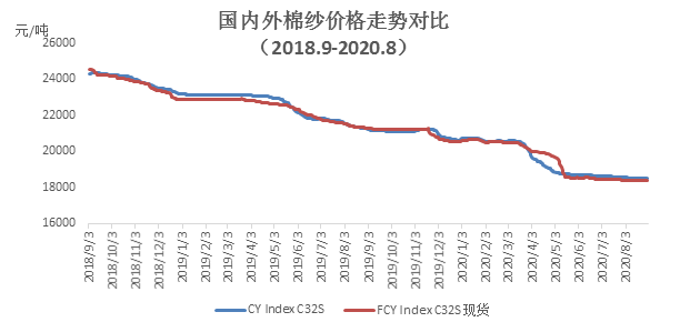 本月內(nèi)外棉紗價格均有所下降。國產(chǎn)32支純棉紗8月均價為18512元/噸,較上月下降81元/噸,跌幅0.44%,較去年同期下跌2872元/噸,跌幅13.43%;進口32支純棉紗月均價18371元/噸,較上月下降74元/噸,跌幅0.4%,較去年同期下跌3013元/噸,跌幅14.1%。