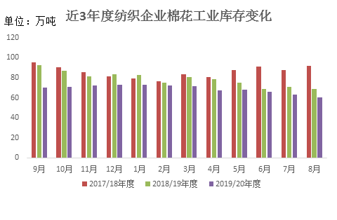 8月下游市場需求雖有好轉,但持續(xù)性不明顯,紡企原料依然維持低庫存,隨用隨買降低庫存壓力。截至8月30日紡企棉花庫存量60.56萬噸,較上月底下降2.39萬噸,同比減少8.17萬噸。其中38%企業(yè)減少棉花庫存,22%增加庫存,40%基本保持不變。