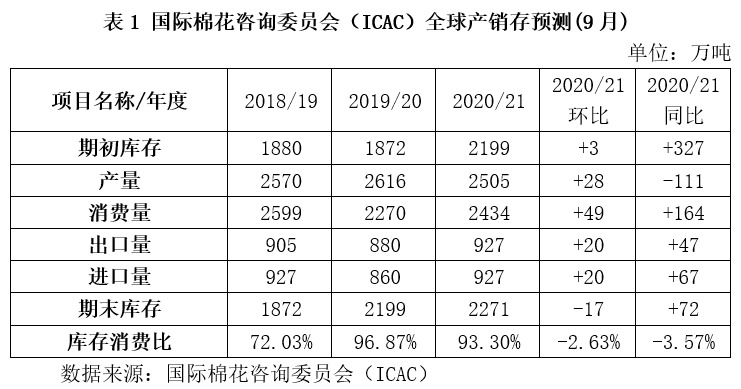 據(jù)國際棉花咨詢委員會(ICAC)最新發(fā)布的全球棉花產(chǎn)需預測(表1),2020/21年度全球棉花產(chǎn)量2505萬噸,較上月上調(diào)28萬噸,同比下降111萬噸,降幅4.2%,消費量2434萬噸,較上月調(diào)增49萬噸,同比增加164萬噸,增幅7.2%。產(chǎn)大于需狀況由2019/20年度的346萬噸縮至2020/21年度的73萬噸。2020/21年度全球庫存消費比由2019/20年度的96.87%下降至93.3%。顯示2020/21年度全球供應壓力預期略有下降。