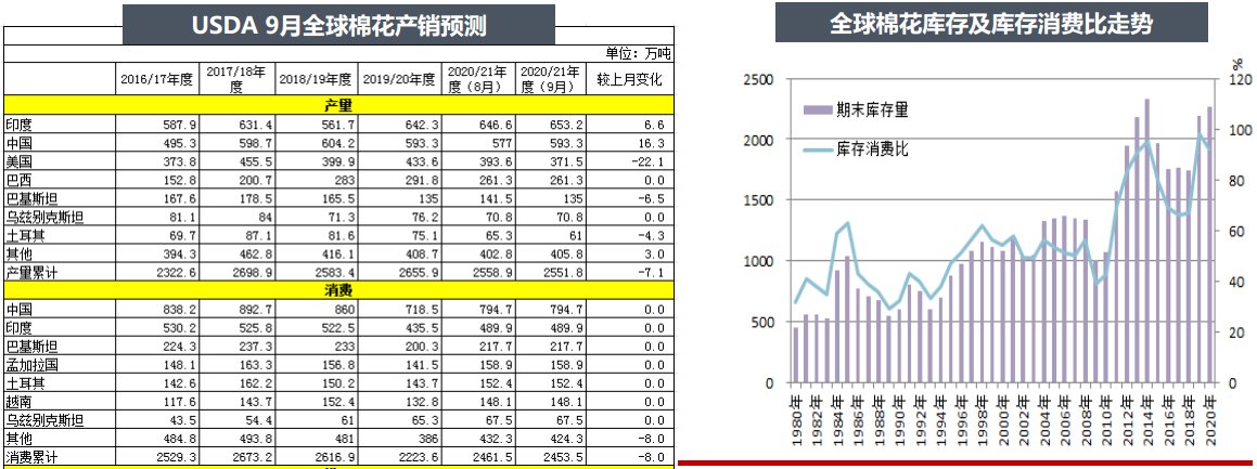 9月USDA全球棉花供需報告中,USDA小幅下調(diào)全球棉花產(chǎn)量7.1萬噸至2551.8萬噸,其中下調(diào)美棉產(chǎn)量22.1萬噸至371.5萬噸,上調(diào)中國棉花產(chǎn)量16.3萬噸至593.3萬噸;全球棉花消費量小幅下調(diào)8萬噸至2453.5萬噸;全球棉花期末庫存下調(diào)23.3萬噸至2260.9萬噸。