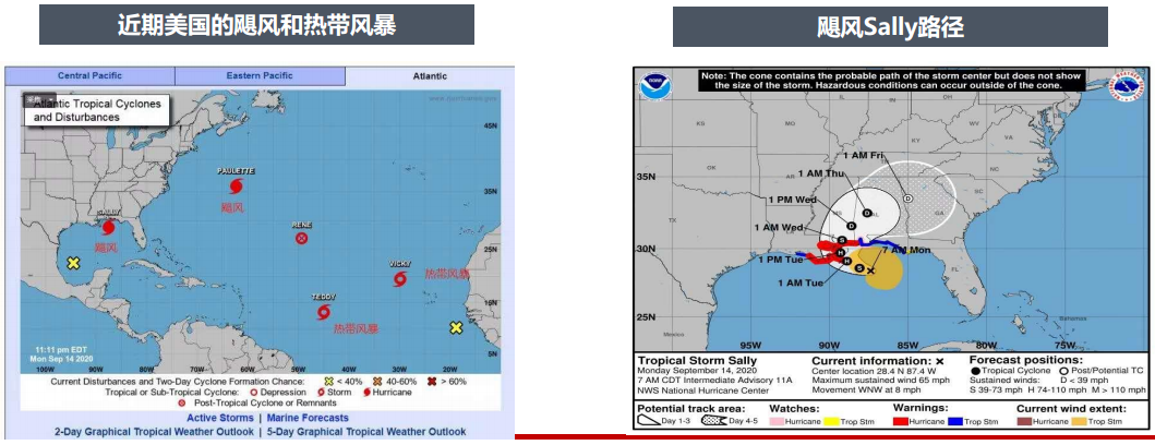 颶風(fēng)登陸三角洲,本周美國附近的大西洋區(qū)域形成4個颶風(fēng)/熱帶風(fēng)暴,分別是Sally(颶風(fēng),將于本周二登錄三角洲地區(qū))、Paulette(颶風(fēng))、Teddy(熱帶風(fēng)暴)、Vicky(熱帶風(fēng)暴)。從目前移動路徑看,Sally可能從美國東南部登陸,襲擊三角洲區(qū)域;Paulette向東北方向移動,與北美大陸方向相反;Teddy有可能登陸美國東海岸;Vicky距離美國東海岸較遠,且預(yù)期風(fēng)速下降,估計無法登陸美國。
