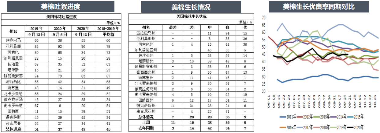 美國農(nóng)業(yè)部9月14日發(fā)布美棉生產(chǎn)報告顯示,截至9月13日美棉吐絮進度為47%,比去年同期減少4個百分點,比過去5年平均值增加2個百分點。美棉收獲進度為6%,比去年同期減少2個百分點,較過去5年平均值減少2個百分點。美棉生長狀況達到良好以上的占45%,與前周持平,較去年同期增加4個百分點。
