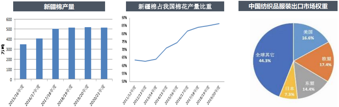 從終端消費結(jié)構(gòu)看,我國紡織品服裝內(nèi)銷外銷比例差不多一半一半,中國出口美國市場占中國紡織品服裝總出口市場比例在17%左右。按照終端消費總量在1000萬噸計算(其中新疆棉占到50%左右、地產(chǎn)棉占到10%左右、進口棉占比小于20%、進口棉紗量占到20%左右),折算下來美國限制新疆棉將直接影響新疆棉量在50萬噸左右。