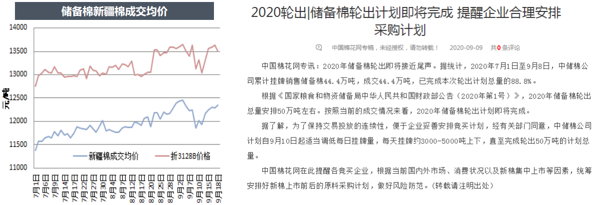 從7月1日到9月18日儲備棉累計成交總量476525噸,成交率99.86%。據(jù)《國家糧食和物資儲備局中華人民共和國財政部公告(2020年第1號)》,2020年儲備棉輪出總量安排50萬噸左右。經(jīng)中國儲備棉管理有限公司請示有關(guān)部門同意,自9月10日起,儲備棉將適當調(diào)低每日掛牌量,每天掛牌約3000-5000噸,直至完成輪出50萬噸的計劃總量。