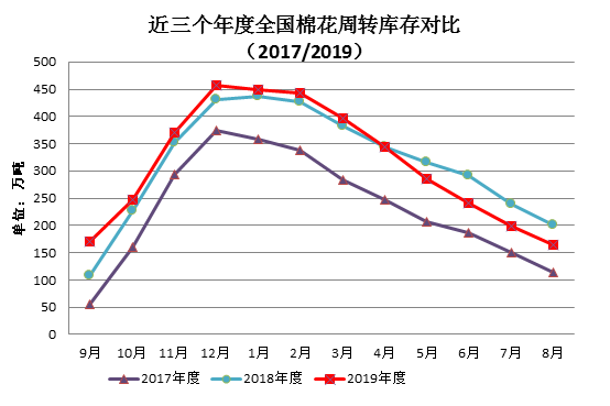 8月紡織市場有所回暖,企業(yè)積極競拍儲備棉,成交價持續(xù)上漲。月末國內(nèi)棉花周轉(zhuǎn)庫存再次下降。據(jù)中國棉花協(xié)會棉花物流分會對全國棉花交易市場18個省市的154家棉花交割和監(jiān)管倉庫的調(diào)查數(shù)據(jù)顯示,8月底全國周轉(zhuǎn)庫存總量約164.96萬噸,低于去年同期35.9萬噸;較上月減少34.21萬噸,降幅17.18%。