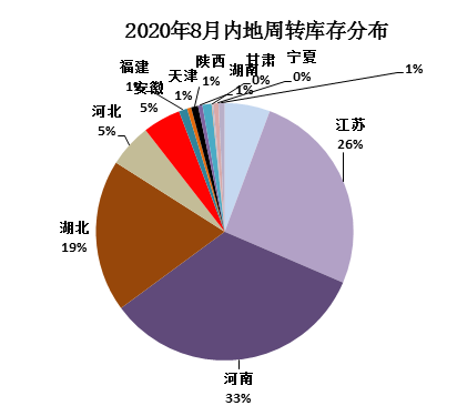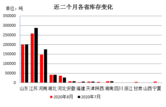 分省份看,江蘇省庫存量保持首位,為25.87萬噸,山東省次之為19.93萬噸,河南省居第三位為14.78萬噸,湖北省為4.22萬噸,河北省為3.68萬噸,其他省在萬噸以下。