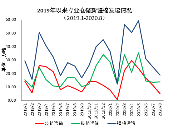 2019年度(2019年9月-2020年8月)出疆棉公路與鐵路共發(fā)運417.28萬噸,同比增加99.42萬噸。