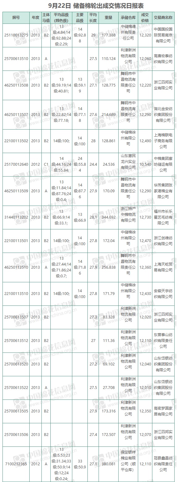 中國儲備棉管理有限公司定于9月22日上市銷售儲備棉重量2917.225噸,實(shí)際成交2917.225噸,成交率100%,成交均價12295元/噸,較21日下跌16元/噸,折3128價格13887元/噸,較21日上漲209元/噸。