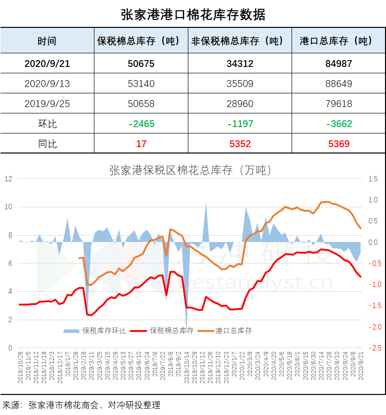據(jù)張家港市棉花商會,截止2020年9月21日,張家港非保稅棉34312噸,保稅棉50675噸,共84987噸。進區(qū)1165噸,出區(qū)4856噸。