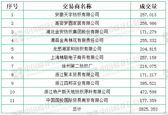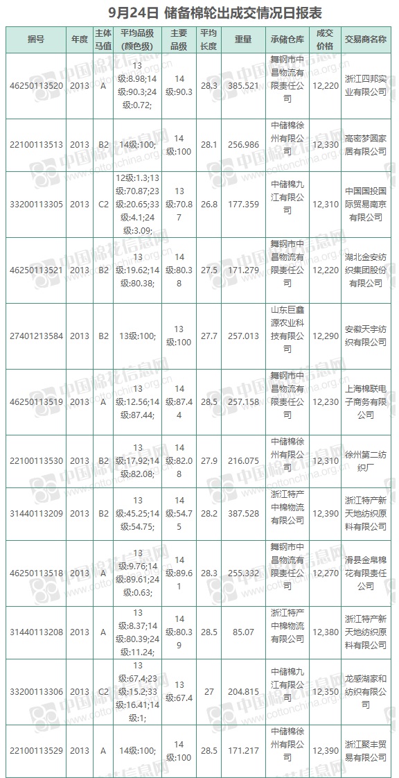 中國(guó)儲(chǔ)備棉管理有限公司定于9月24日上市銷(xiāo)售儲(chǔ)備棉重量2825.353噸,實(shí)際成交2825.353噸,成交率100%,成交均價(jià)12302元/噸,較23日下跌102元/噸,折3128價(jià)格13604元/噸,較23日下跌152元/噸。