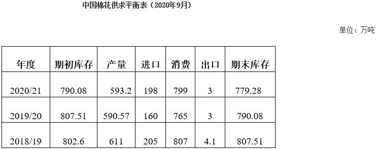 8月,紡織傳統(tǒng)旺季臨近,市場有所好轉(zhuǎn),企業(yè)訂單增加,國內(nèi)棉價(jià)持續(xù)上漲,儲備棉輪出繼續(xù)全部成交,棉花商業(yè)庫存下降。中國棉花協(xié)會預(yù)測,2020/21年度全國棉花總產(chǎn)593.15萬噸,同比增長0.44%;進(jìn)口量198萬噸,同比增長25.3%;消費(fèi)量799萬噸,同比增長4%。