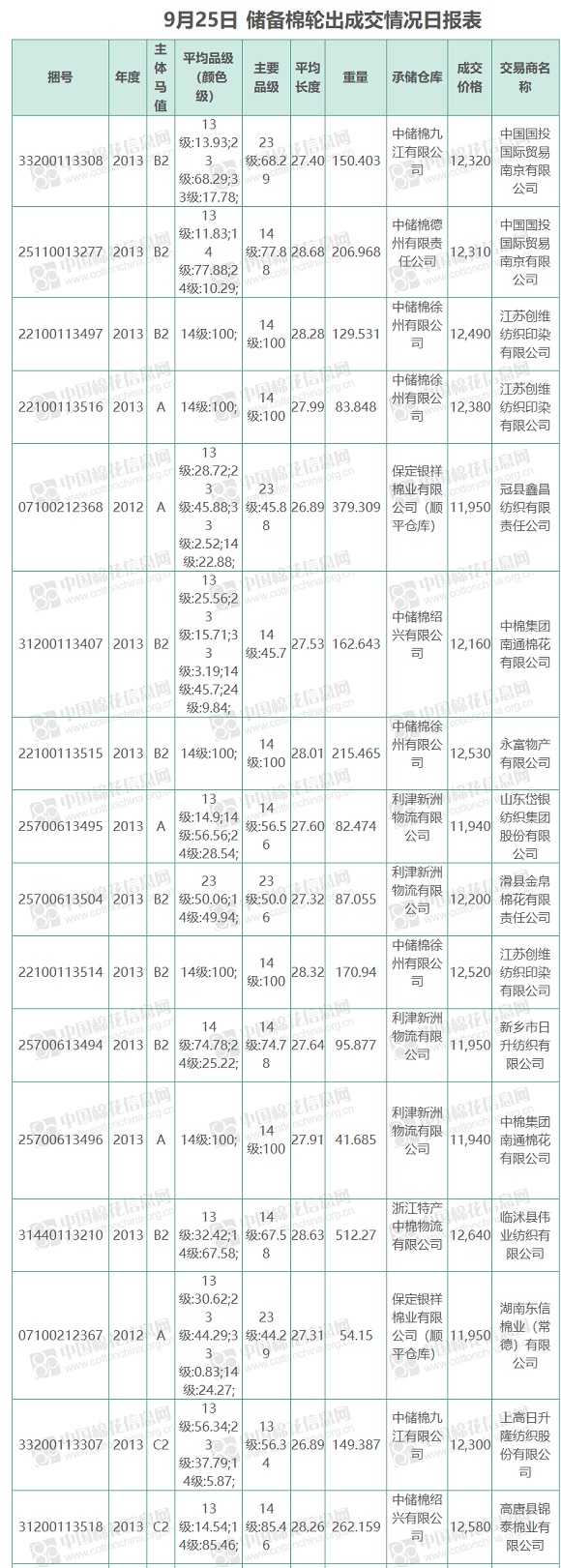 中國儲備棉管理有限公司定于9月25日上市銷售儲備棉重量2784.164噸,實際成交 2784.164噸,成交率100%,成交均價12339元/噸,較24日上漲37元/噸,折3128價格13707元/噸,較24日上漲103元/噸。